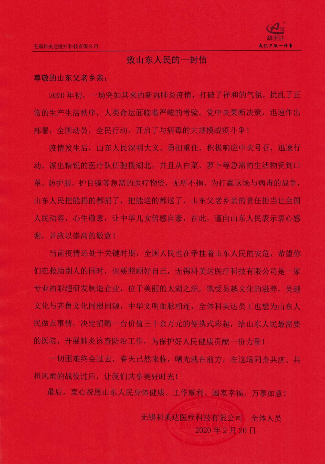 庚子年初,新冠肺炎疫情洶涌而來,隨著鐘南山院士馳援武漢指出新冠肺炎存在“人傳人”的現(xiàn)象,一場史無前例的疫情攻堅(jiān)戰(zhàn)在全國打響。武漢告急,全國馳援,從生活物資到醫(yī)療用品源源不斷往最需要的地方,山東人民搬家式的支援抗疫模式更是感動(dòng)了全國人民,彩超作為新冠肺炎病情診斷的重要手段,得到臨床專家的重視,為緩解疫情防控期間醫(yī)療物資緊缺狀況,有效防范醫(yī)護(hù)人員感染和疫情擴(kuò)散風(fēng)險(xiǎn),科美達(dá)公司主動(dòng)聯(lián)系山東省慈善機(jī)構(gòu),向濟(jì)南市鋼城區(qū)慈善總會(huì)定向捐贈(zèng)了價(jià)值38萬元的便攜式彩超設(shè)備,用于濟(jì)南市鋼城區(qū)醫(yī)院抗擊肺炎疫情和人民健康檢查,確保戰(zhàn)略后方穩(wěn)固。